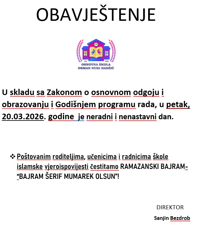 U skladu sa Zakonom o osnovnom odgoju i obrazovanju i Godišnjem programu rada, u petak, 20.03.2026. godine je neradni i nenastavni dan.